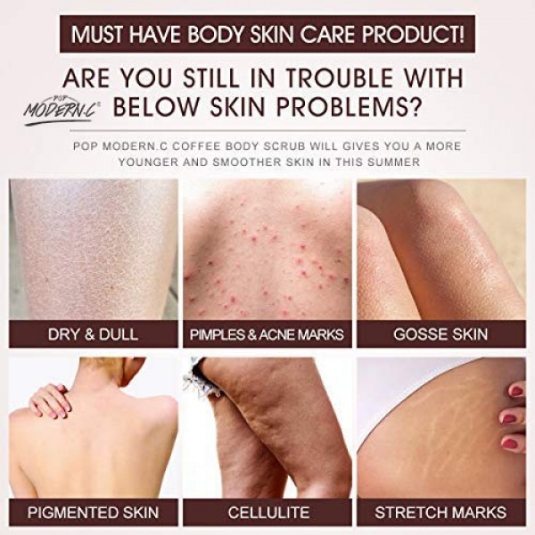 100% INGREDIENT SAFETY& SATISFACTION : Gluten-Free, Nut-Free, Soy-Free, Vegan, Nano-Free, Safety in Use Tested. 180 days with a replacement or full refund if you are unsatisfied with our product or doesn’t work for you.No any risk to purchase POP MODERN.C COFFEE BODY SCRUB EXFOLIATOR.